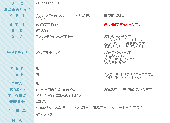 メモリ3GBまで増設済みです。 HDDは160GBに増設済み大容量です。 DVDマルチドライブ搭載です。 メイン機の入れ替えにお勧めです。 WindowsXP-Proセットアップ済みなので、到着後直ぐにご利用になれます。
