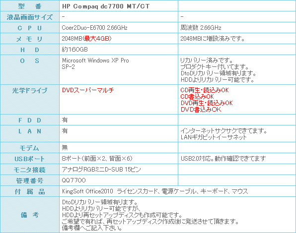 ハイスペックなデスクトップパソコンです。 メール、インターネット、ワープロはもちろんのこと、動画再生・DVD作成・画像編集等この一台でお任せ下さい。 XP-Proセットアップ済みなので、到着後直ぐにご利用になれます。 【KingSoft Officeインストール済み】 Microsoft officeに互換性のあるソフトです。ワード、エクセル、パワーポイントのファイルがこのソフトで開けて、編集も可能です。 kingsoftの詳細ページはこちら。