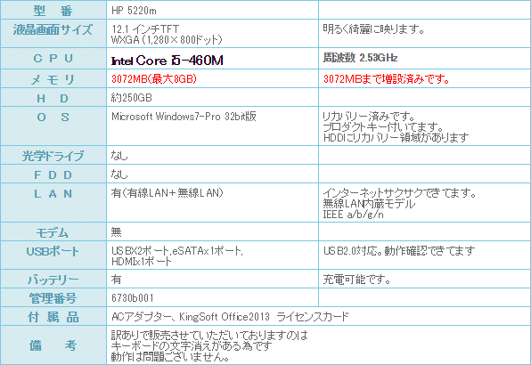 高性能のハイスペックノートパソコン HP 5220mの入荷です。