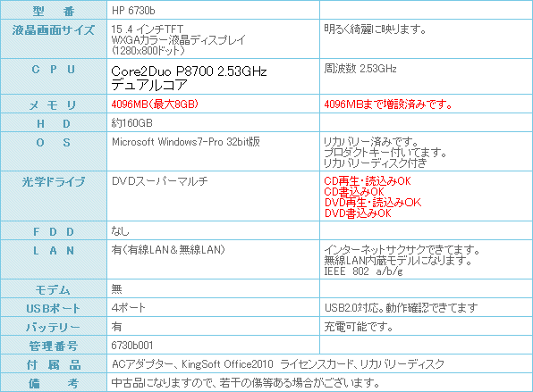 高性能のハイスペックノートパソコン HP 6730bの入荷です。