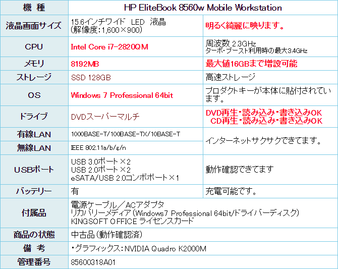 高性能のハイスペックノート モバイルワークステーション 8560wの入荷です。
