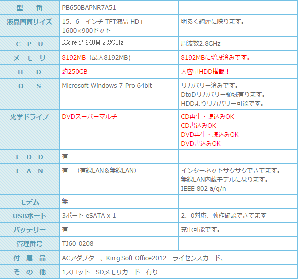 安心の東芝の Dynabook satellite B650/B 入荷です。