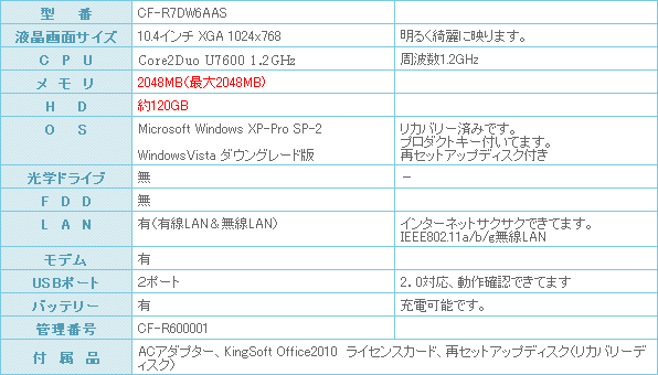 CPUはCore2Duo U7600 (1.2GHz)搭載!