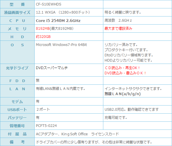 CPUはCore i5 2540M 2.6GHz搭載になります。