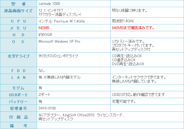 軽量でお人気のハイスペックDELLノートPCの入荷です。 出張のお供に如何でしょうか?お勧めの一台です。 メモリーは640MBまで増設済みです。 中古のモバイルノートとしては珍しく外付けDVDコンボも付いています。しかも無線LAN内蔵タイプです。 そして見やすい12.1インチ液晶搭載です。 CPUはPentium-M1.2GHzと早いです。 結構、薄めで軽いノートパソコンです。 持ち運びも便利かと思います。 KINGSOFT OFFICE 2010インストール済みです。ワープロ機能・表計算ソフト・プレゼントテーション資料作成もバッチリOKです。マイクロソフト OFFICE と使い方は同じです。データー互換もOKです。 お勧めの一台です。ビックリ価格の15800円!!