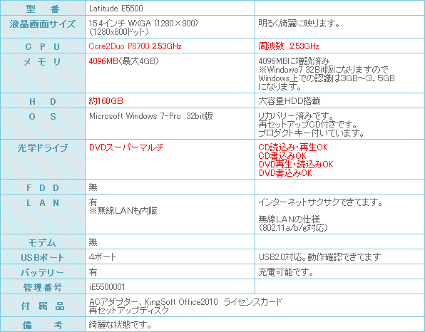 DELL Latitude E5500 WIndows7-Pro搭載のモデルになります。
