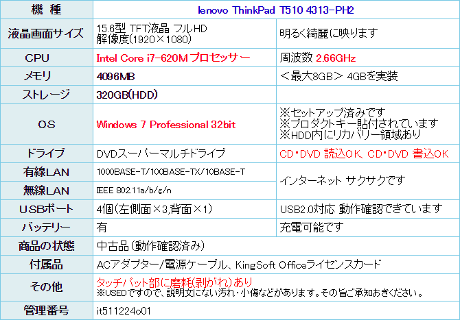 lenovo ThinkPad T510 4313-PH2 です。