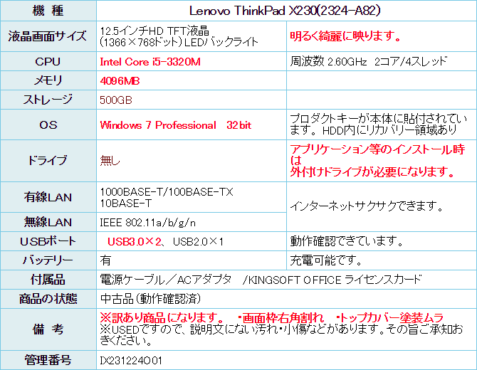 ハイスペックThinkPad X230が入荷しました。