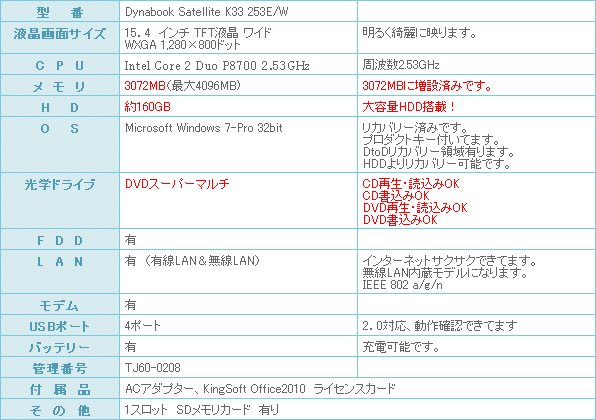 安心の東芝の dynabook Satellite K33 253E/W入荷です。