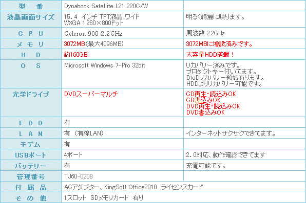 安心の東芝の dynabook Satellite L21 220C/W入荷です。
