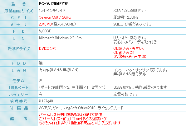 KINGSOFT OFFICE インストール済みです。 ワープロ機能・表計算ソフト・プレゼントテーション資料作成もバッチリOKです。 マイクロソフト OFFICE と使い方は同じです。データー互換もOKです。 希少価値が高いwindowsXP搭載のパソコンは今後どんどん減っていくと思われます。 これ1台でワープロ・表計算等オフィス付き、インターネット・メールも動画鑑賞と何でもこなせます。 訳有りでご提供させていただいておりますのはパームレストのトの擦れ跡左パームレスト前面に1cmほどの塗装ハケ動作にはまったく問題ございません。 保証ももちろん3ケ月通常商品と同じ扱いで価格を、値下げさせていただきました。 1台のみのご提供となります。 【KingSoft Officeインストール済み】 Microsoft officeに互換性のあるソフトです。ワード、エクセル、パワーポイントのファイルがこのソフトで開けて、編集も可能です。 kingsoftの詳細ページはこちら。