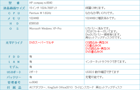 HP compaq nx9040 DVDスーパーマルチ搭載です。