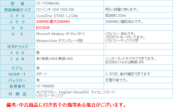 CPUはCore2Duo U7600 (1.2GHz)搭載!