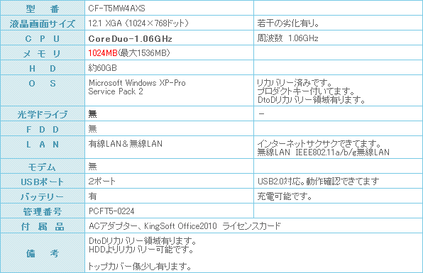 メモリーも1024MBへ増設済みです。 無線LAN内蔵モデルになります。 WindowsXP-Proセットアップ済みなので、到着後直ぐにご利用になれます。 ワープロ・インターネット・メール等もスムーズにサクサク動きます。