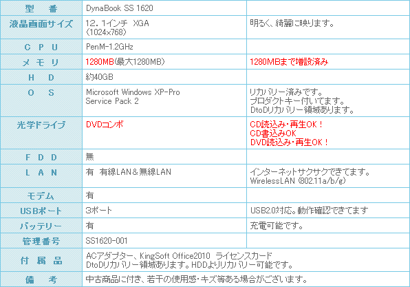 無線LAN内蔵の軽量ボディーのDynabook SS 1620になります。
