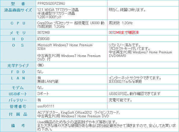 CPUはCore2Duo プロセッサー 超低電圧 U9300 動作周波数 1.2GHz搭載とモバイルPCには持った無い位の威力を発揮します。