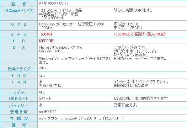 CPUはCore2Duo プロセッサー 超低電圧 U7600 動作周波数 1.2GHz搭載とモバイルPCには持った無い位の威力を発揮します。