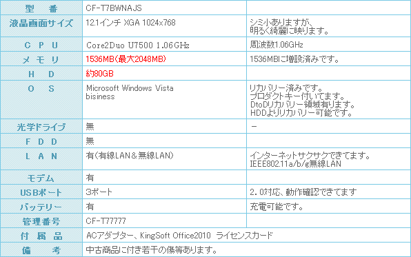 CPUはCore2Duo U7500 (1.06GHz)搭載! 無線LAN内蔵モデルになります。出先で重宝すること間違いなし!!