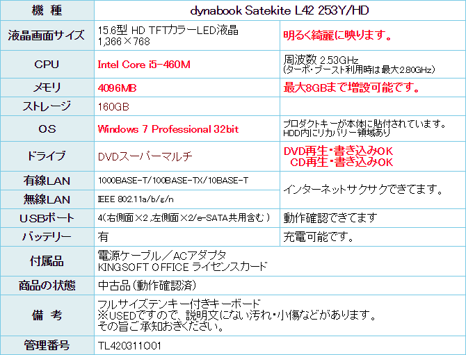 メモリー4GBに増設済みです。 Windows 7 Professionalサクサク動きます。