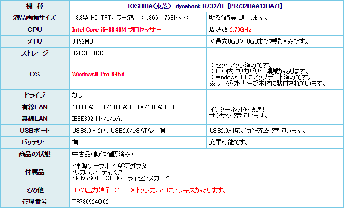 dynabook R732/H が入荷しました!