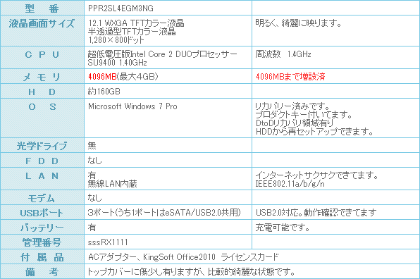 CPUはCore2Duo プロセッサー 超低電圧 SU9400 動作周波数 1.4GHz搭載とモバイルPCには持った無い位の威力を発揮します。