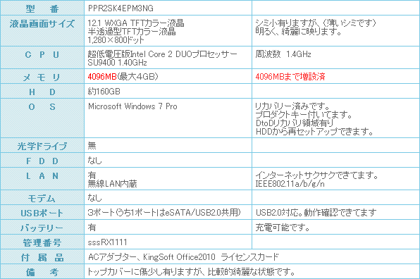 中古パソコン商品スペック詳細