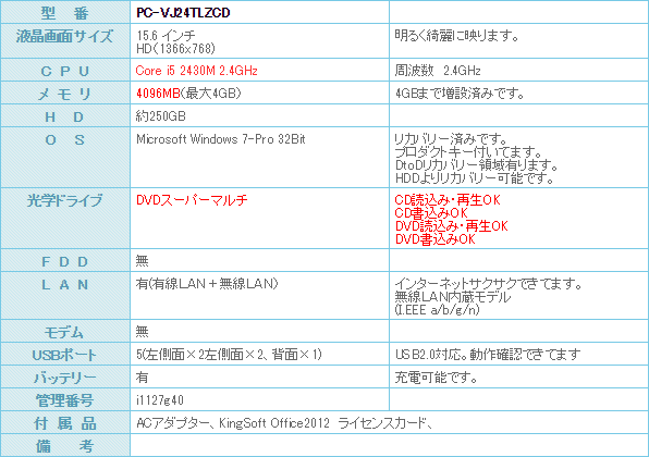 Core i5 2430M 2.4GHz(搭載のマシンになります。