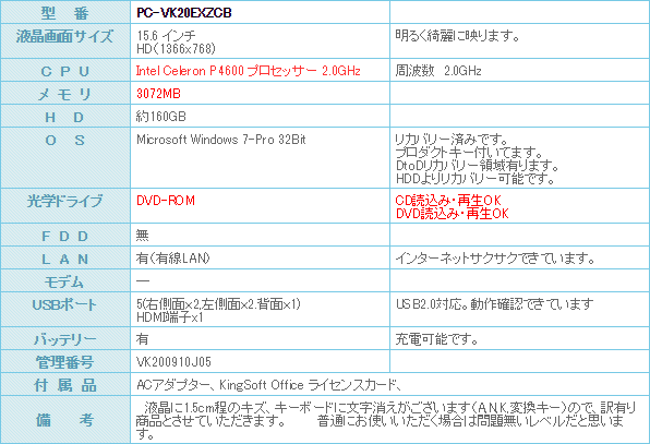 液晶に1.5cm程のキズ、キーボードに文字消えがございます(A,N,K,変換キー)ので、訳有り商品とさせていただきます。 普通にお使いいただく場合は問題無いレベルだと思います。
