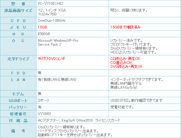 メモリーも1.5GBまで増設済みです。 さらにCPUはCoreDuo-1.06GHz搭載!! モバイルPCでは高性能のCPUを積んでいます。
