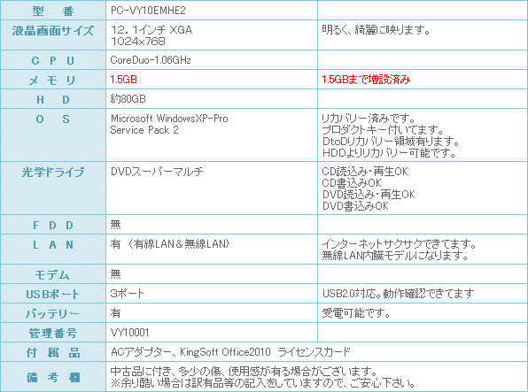 メモリーも1.5GBまで増設済みです。 さらにCPUはCoreDuo-1.06GHz搭載!! デュアルコア搭載です。 モバイルPCでは高性能のCPUを積んでいます。 私も出先に持ち歩いて使っていますが、結構、起動等早いです。