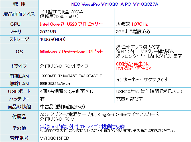 NEC VersaPro VY10GC-A PC-VY10GCZ7A。 非常に機動性の高い軽量モバイルノートPCです。