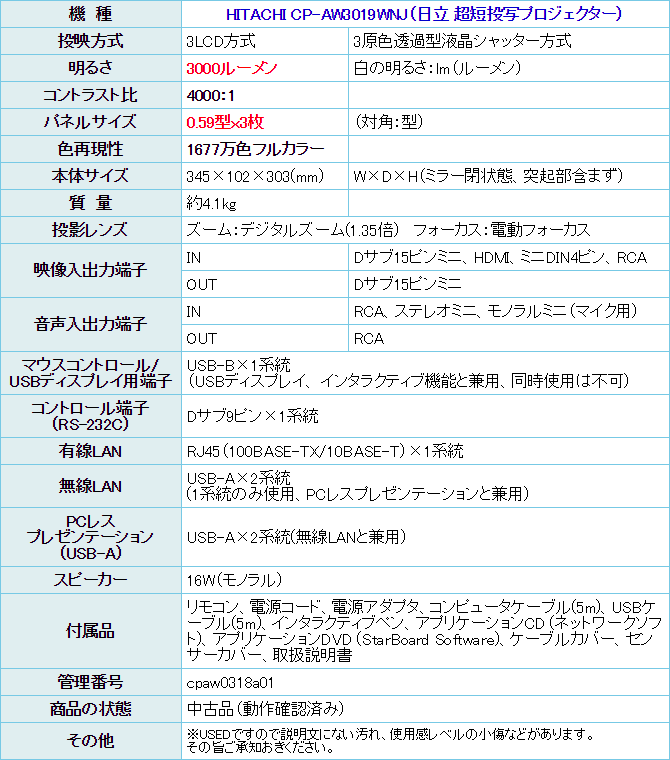 日立の液晶プロジェクター、 HITACHI CP-AW3019WNJ。