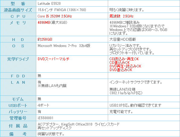 DELL Latitude E5520 WIndows7-Pro搭載のモデルになります。