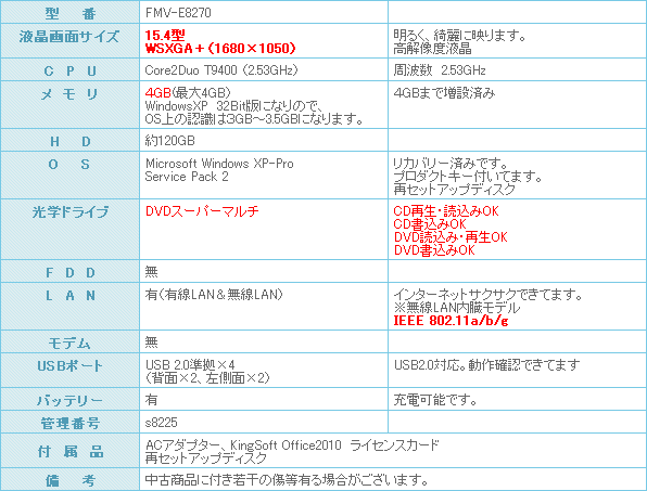 中古パソコン商品スペック詳細