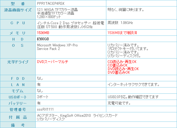 CPUはCore2Duo プロセッサー 超低電圧 U7500 動作周波数 1.06GHz搭載とモバイルPCには持った無い位の威力を発揮します。デュアルコア搭載です。