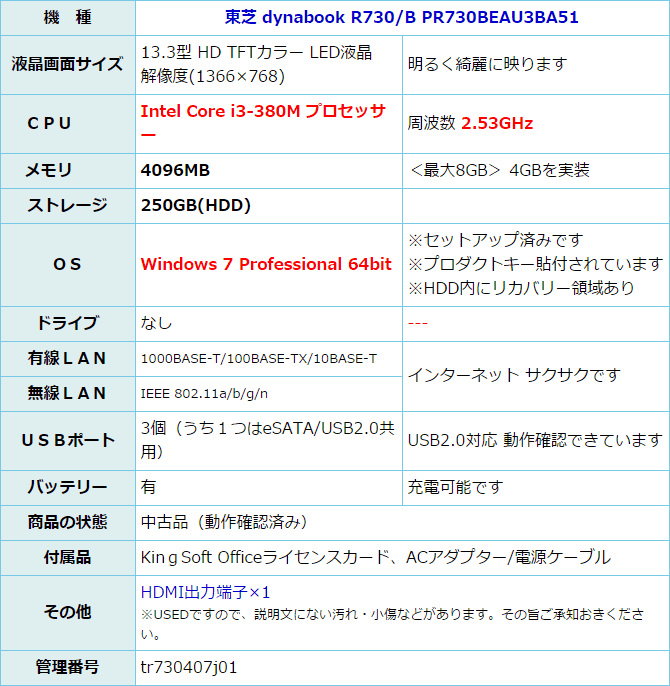 東芝 dynabook R730/B PR730BEAU3BA51 です。