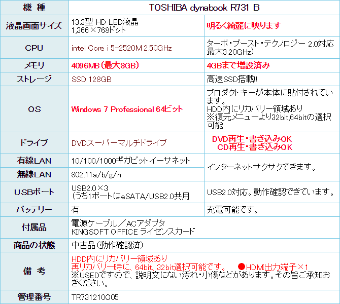 Windows7-Pro 64Bit版にてリカバリー済みです。